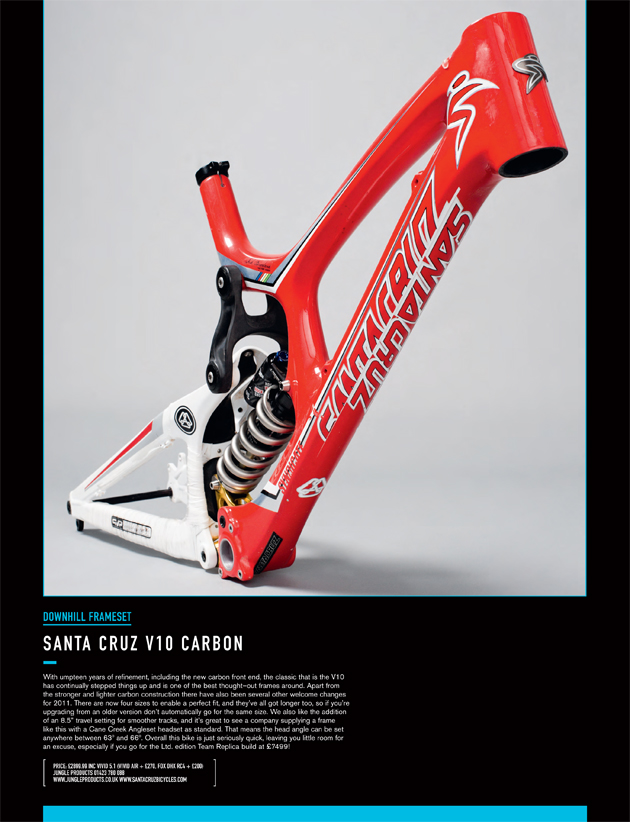 With umpteen years of refinement, including the new carbon front end, the classic that is the V10 has continually stepped things up and is one of the best thought–out frames around. Apart from the stronger and lighter carbon construction there have also been several other welcome changes for 2011. There are now four sizes to enable a perfect fit, and they’ve all got longer too, so if you’re upgrading from an older version don’t automatically go for the same size. We also like the addition of an 8.5” travel setting for smoother tracks, and it’s great to see a company supplying a frame like this with a Cane Creek Angleset headset as standard. That means the head angle can be set anywhere between 63º and 66º. Overall this bike is just seriously quick, leaving you little room for an excuse, especially if you go for the Ltd. edition Team Replica build at £7499!