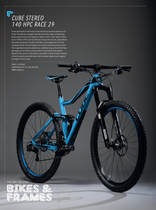 As we said earlier in this issue it was the Stereo that first alerted us to Cube. The bike has changed a fair bit since then, with no fewer than three versions now up for grabs (a 160mm x 27.5”, this 140mm 29’er, and a 120mm 29’er), but we still love it every bit as much, especially in this particular guise. As before this bike’s main appeal lies in its low slung geometry, one that begs to be pushed hard around any corner. The suspension is pretty decent too, a definite step up from the Fritzz, although much of that could be down to the excellent RockShox Monarch Plus shock. In fact there’s very little to fault full stop in terms of the kit used to build this bike, which is what makes it such a good package for the money.