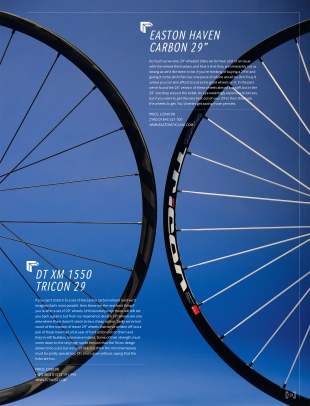 If you can’t stretch to a set of the Easton carbon wheels (and we’d imagine that’s most people), then these are the next best thing if you’re after a set of 29” wheels. Unfortunately even these will still set you back a grand, but from our experience decent 29” wheels are one area where there doesn’t seem to be a cheap option. Sadly we’ve lost count of the number of lesser 29” wheels that we’ve written off, but a pair of these have had a full year of hard action put on them and they’re still faultless. Impressive indeed. Some of their strength must come down to the very high spoke tension that the Tricon design allows to be used, but we can’t help but think the rims themselves must be pretty special too. Oh, and it goes without saying that the hubs are too.