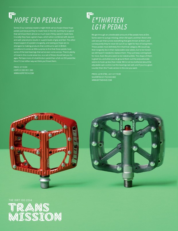 Some of our overseas readers might think we’ve chosen these Hope pedals just because they’re made here in the UK, but they’re so good that we’d love them almost as much even if they weren’t made here. Crucially they have a great shape, which when combined with decent and well–placed pins results in superb levels of grip and feel. The other import aspect of a pedal is longevity, and seeing as Hope are no strangers to making products that continue to spin in British conditions it comes as little surprise to find that these pedals have some of the best bearings that we’ve ever come across. There’s plenty of meat in the crucial areas too, so a set of these should last you for ages. Perhaps more of a trail/enduro pedal than a full–on DH pedal like the e13, but either way we think you’ll love them.