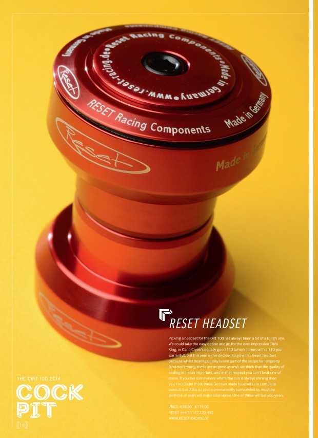 Picking a headset for the Dirt 100 has always been a bit of a tough one. We could take the easy option and go for the ever impressive Chris King, or Cane Creek’s equally good 110 (which comes with a 110 year warranty!), but this year we’ve decided to go with a Reset headset because whilst bearing quality is one part of the recipe for longevity (and don’t worry, these are as good as any), we think that the quality of sealing is just as important, and in that respect you can’t beat one of these. If you live somewhere where the sun is always shining then you’ll no doubt think these German made headsets are complete overkill, but if like us you’re permanently surrounded by mud the plethora of seals will make total sense. One of these will last you years.