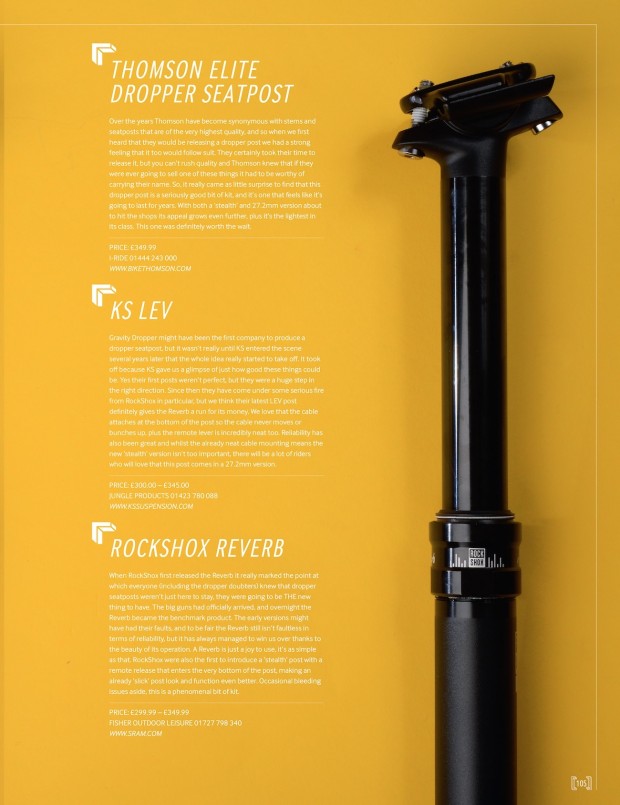 When RockShox first released the Reverb it really marked the point at which everyone (including the dropper doubters) knew that dropper seatposts weren’t just here to stay, they were going to be THE new thing to have. The big guns had officially arrived, and overnight the Reverb became the benchmark product. The early versions might have had their faults, and to be fair the Reverb still isn’t faultless in terms of reliability, but it has always managed to win us over thanks to the beauty of its operation. A Reverb is just a joy to use, it’s as simple as that. RockShox were also the first to introduce a ‘stealth’ post with a remote release that enters the very bottom of the post, making an already ‘slick’ post look and function even better. Occasional bleeding issues aside, this is a phenomenal bit of kit.