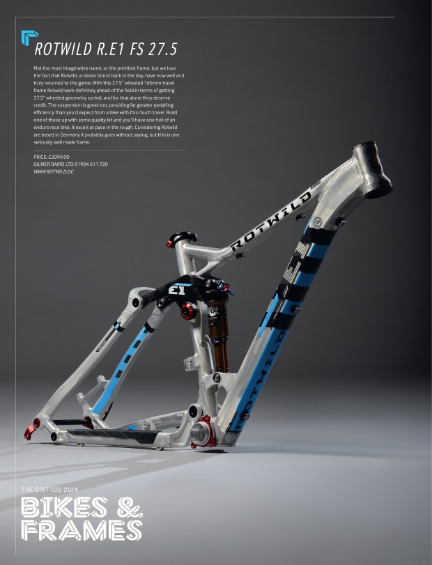 Not the most imaginative name, or the prettiest frame, but we love the fact that Rotwild, a classic brand back in the day, have now well and truly returned to the game. With this 27.5” wheeled 165mm travel frame Rotwild were definitely ahead of the field in terms of getting 27.5” wheeled geometry sorted, and for that alone they deserve credit. The suspension is great too, providing far greater pedalling efficiency than you’d expect from a bike with this much travel. Build one of these up with some quality kit and you’ll have one hell of an enduro race bike, it excels at pace in the rough. Considering Rotwild are based in Germany it probably goes without saying, but this is one seriously well made frame.