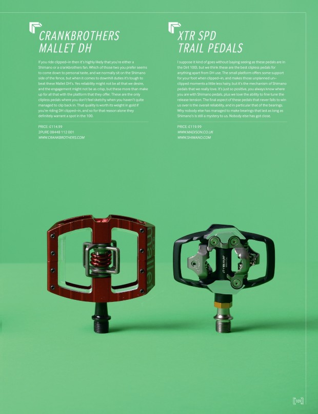 I suppose it kind of goes without saying (seeing as these pedals are in the Dirt 100), but we think these are the best clipless pedals for anything apart from DH use. The small platform offers some support for your foot when clipped–in, and makes those unplanned un-clipped moments a little less hairy, but it’s the mechanism of Shimano pedals that we really love. It’s just so positive, you always know where you are with Shimano pedals, plus we love the ability to fine tune the release tension. The final aspect of these pedals that never fails to win us over is the overall reliability, and in particular that of the bearings. Why nobody else has managed to make bearings that last as long as Shimano’s is still a mystery to us. Nobody else has got close.