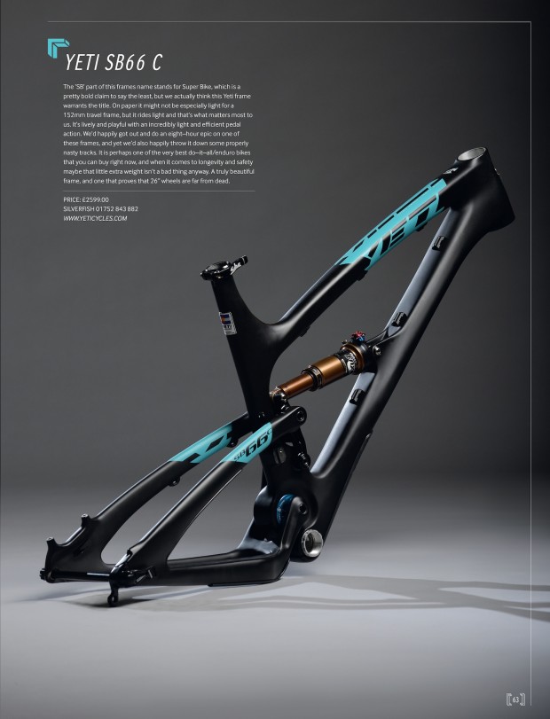 The ‘SB’ part of this frames name stands for Super Bike, which is a pretty bold claim to say the least, but we actually think this Yeti frame warrants the title. On paper it might not be especially light for a 152mm travel frame, but it rides light and that’s what matters most to us. It’s lively and playful with an incredibly light and efficient pedal action. We’d happily got out and do an eight–hour epic on one of these frames, and yet we’d also happily throw it down some properly nasty tracks. It is perhaps one of the very best do–it–all/enduro bikes that you can buy right now, and when it comes to longevity and safety maybe that little extra weight isn’t a bad thing anyway. A truly beautiful frame, and one that proves that 26” wheels are far from dead.