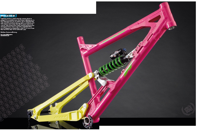 Frightening attention to detail makes this company almost an exception in mountainbike terms. Carl Nicolai is definitely one of a kind. Featuring proven four–bar platform with an adjustable head angle and bottom bracket (in fact any angle for a small extra cost) it is a made to order wonder.