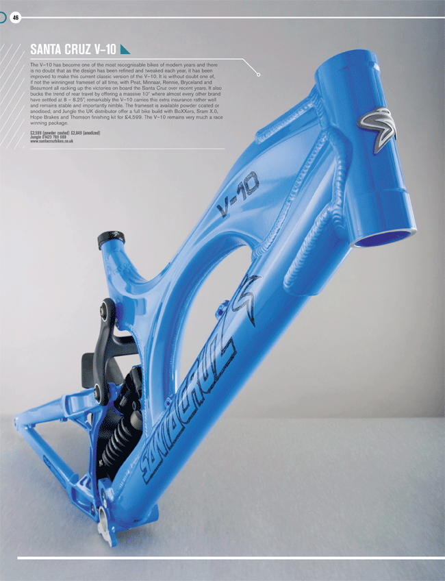 The V–10 has become one of the most recognisable bikes of modern years and there is no doubt that as the design has been refined and tweaked each year, it has been improved to make this current classic version of the V–10. It is without doubt one of, if not the winningest frameset of all time, with Peat, Minnaar, Rennie, Bryceland and Beaumont all racking up the victories on board the Santa Cruz over recent years. It also bucks the trend of rear travel by offering a massive 10” where almost every other brand have settled at 8 – 8.25”, remarkably the V–10 carries this extra insurance rather well and remains stable and importantly nimble. The frameset is available powder coated or anodised, and Jungle the UK distributor offer a full bike build with BoXXers, Sram X.0, Hope Brakes and Thomson finishing kit for £4,599. The V–10 remains very much a race winning package.