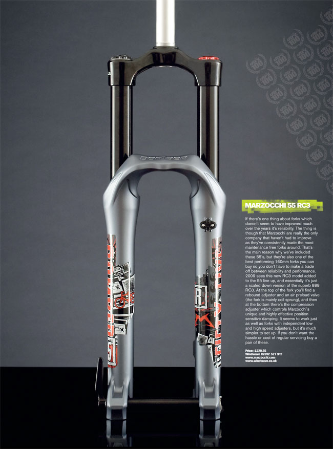 If there’s one thing about forks which doesn’t seem to have improved much over the years it’s reliability. The thing is though that Marzocchi are really the only company that haven’t had to improve as they’ve consistently made the most maintenance free forks around. That’s the main reason why we’ve included these 55’s, but they’re also one of the best performing 160mm forks you can buy so you don’t have to make a trade off between reliability and performance. 2009 sees this new RC3 model added to the 55 line up, and essentially it’s just a scaled down version of the superb 888 RC3. At the top of the fork you’ll find a rebound adjuster and an air preload valve (the fork is mainly coil sprung), and then at the bottom there’s the compression adjuster which controls Marzocchi’s unique and highly effective position sensitive damping. It seems to work just as well as forks with independent low and high speed adjusters, but it’s much simpler to set up. If you don’t want the hassle or cost of regular servicing buy a pair of these.