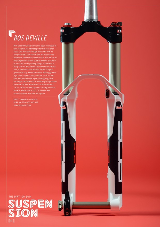 With the Deville BOS have once again managed to take the prize for ultimate performance in their class. Like the Idylle though this isn’t a fork for everyone, it’s a true racer’s fork. It’s not quite as reliable as a RockShox or Marzocchi, and it’s not as easy to get fixed either, but the rewards are there to be had if you’re pushing things to the limit. It really is at the limit where this fork comes into its own, it just works that little bit better at higher speeds than say a RockShox Pike, offering greater high speed support, but you have to be honest with yourself because if you’re not going to be pushing it into that kind of territory you’ll probably be better off with another fork. Choice wise it’s 160 or 170mm travel, tapered or straight steerer, black or white, and 26 or 27.5” wheels. We wouldn’t bother with the TRC option.