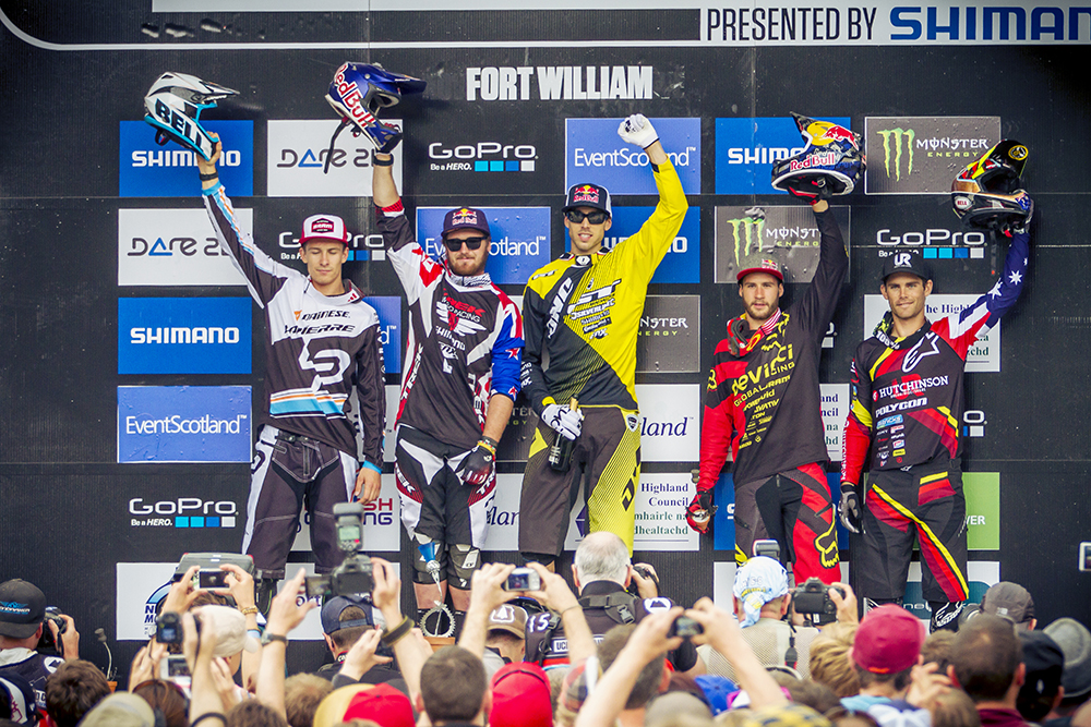 The course is a full-on, flat-out, no-compromise charge down the face of Aonach Mor, the ninth highest mountain in the UK. A succession of big jumps and bumps, berms, drop-offs, rock slabs and technical natural sections provided plenty of challenges for the riders, all the way from the top gondola station at 655m to the magnificent finish section above the Nevis Range car park.
