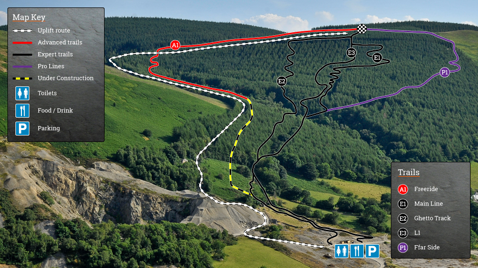 Revolution Bike Park is situated in 110 acres of private woodland at the foot of the Snowdonia National Park. Uplifts run on Friday, Saturday and Sunday but are also available on other days if booked by a group. You can expect around 10-18 runs a day, which equates to a fairly whooping 4500m of descending in one day. There is parking, toilets and a small hut on site, but it’s always undergoing development so expect further facilities and tracks in future. As it stands now though it’s still a great venue with five tracks ranging from red to black. This place is definitely not aimed at beginners and is also home to the quarry line which has been made famous by Dan Atherton. A video of him riding it can be seen below.