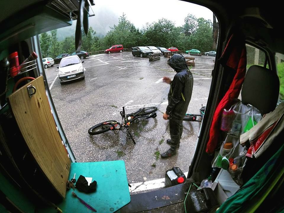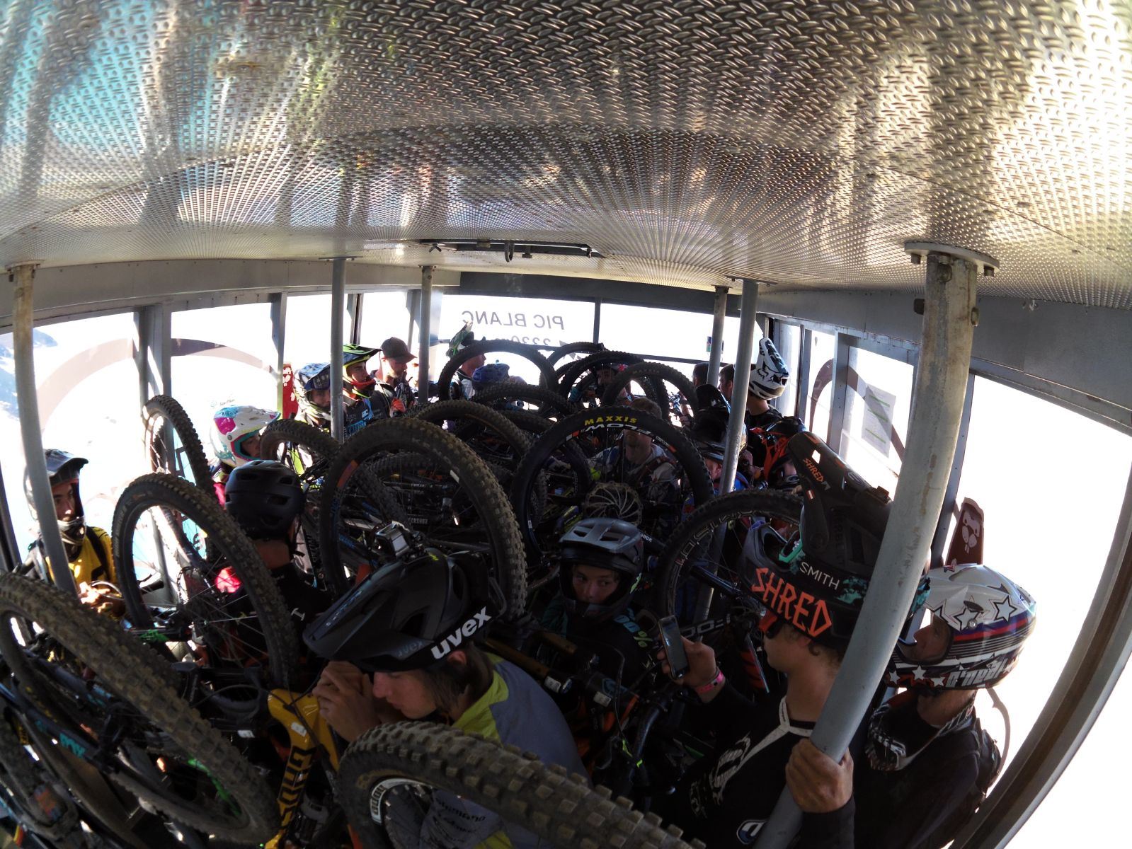 This meant getting up 5.30am to get on the first few lifts. However. on arrival at the midway station, a crowd of confused riders stood about as the winds and clouds rolled in. The inevitable happened and organisers decided call off racing from the top of the hill due to the severe weather so riders were forced to ride back down to the first lift station. There was another anxious wait trying to find shelter from the weather before we finally got lined up at a new starting point.