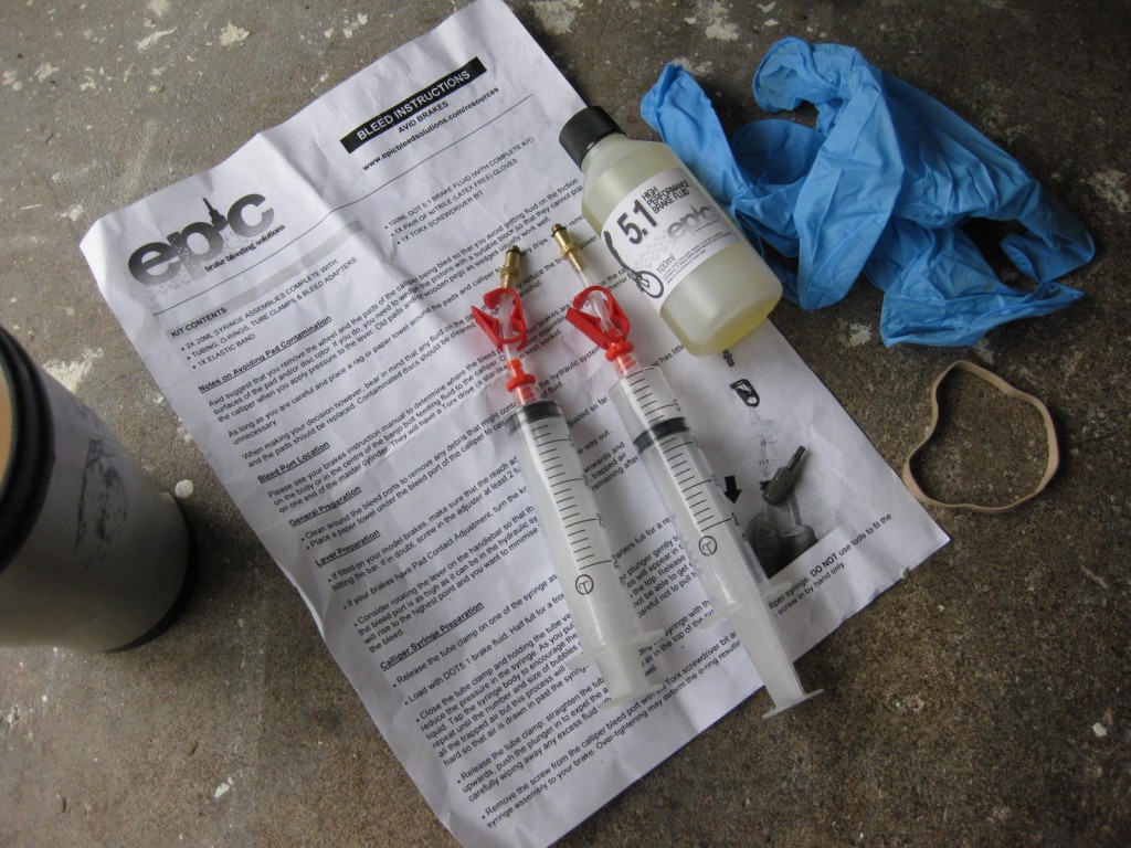 What’s in the kit then, the official Avid kits come with pad spacers and sometimes with barbs, the epic kits come with, a “how to” sheet, a T-10 torx bit for the bleed grub screws, a pair of gloves, 100ml of dot5.1 fluid, an elastic band (third hand, holds the lever down) and two syringes with fittings and hose locks…£12.99