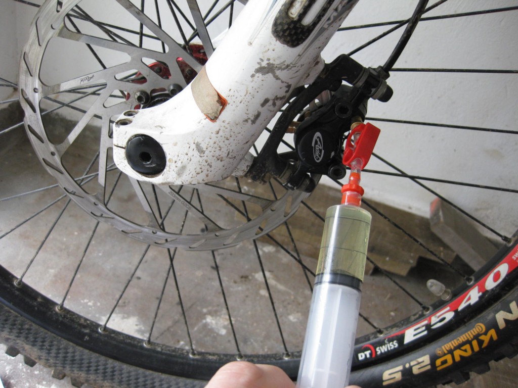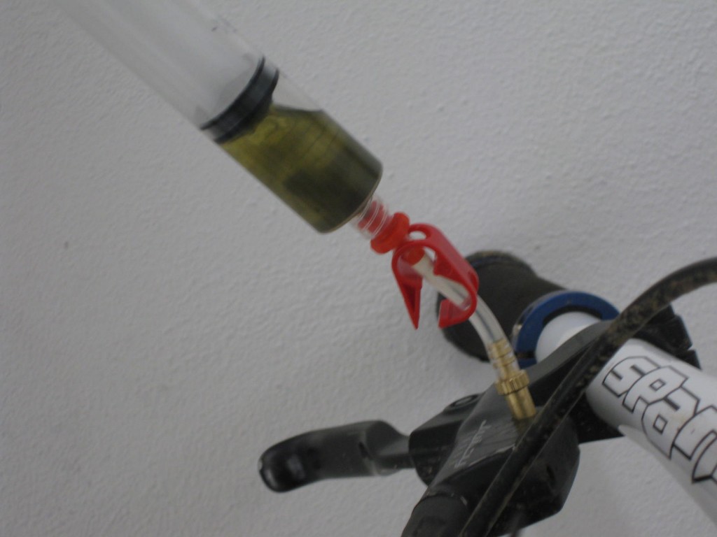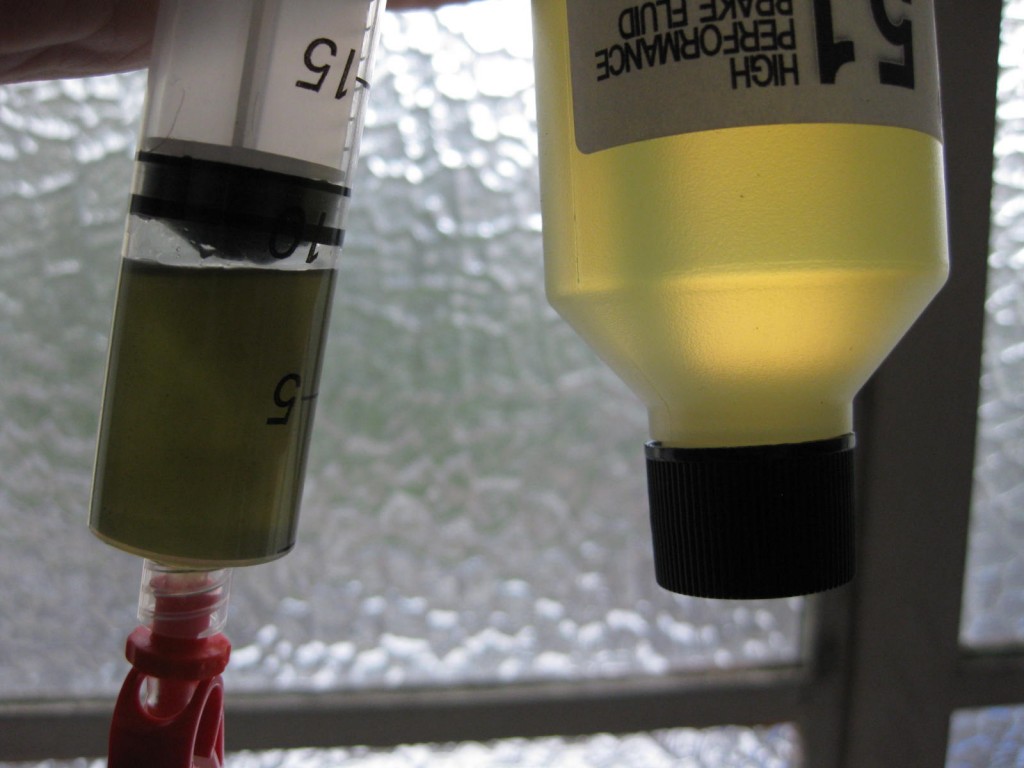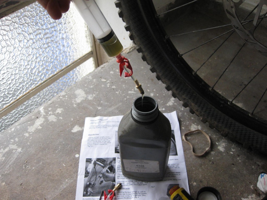 I won’t go into full detail, but just skim through the process, more information and tips are over on Epics website. As I am now a master of bleeding having only done it once before, I was brave and left the pads in the caliper. Prime a syringe with fluid and screw into the caliper, then attach the other empty syringe to the lever/cylinder. Then just push through around 15ml of fluid.