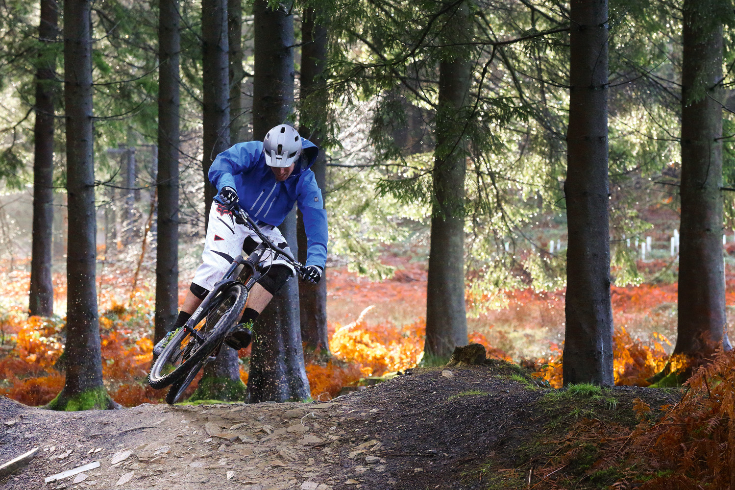 We’re out of mellow now and hunting down six consecutive drops, pushing arms out and hips back as the front wheel transitions from dirt to air. Cushion the landings, stay off the binders, the front tyre has quite enough to do chasing grip from under autumn leaves. A nasty root step is next up and you’re determined to get light and be brave, letting the bike find the fast path down. Steep, consecutive hairpins, remember those Alps trips, drop a shoulder, get inside the corner and then back on it, look up, take a breath.