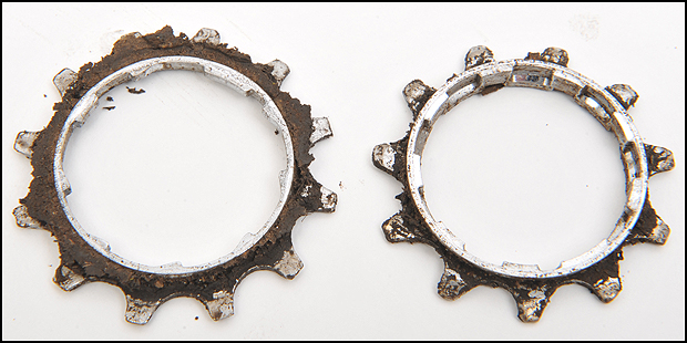 Finally, and as I pointed out in the video, it’s worth checking that the lock-ring hasn’t just bottomed-out the smallest cog onto the freehub body rather than locked the whole cassette into place. As you can see in the picture the smallest cog (on the right) has a step on the inside unlike the rest of the cogs (as illustrated on the left). If the tolerances aren’t quite right then sometimes this step can hit the freehub body before everything else is clamped up tight. You’ll know if this is the case because although your lock-ring is tight you’ll still be able to move the bigger cogs a little. It’s increasingly rare for this to happen these days, but if it does it can be easily solved with a thin washer which you put on the freehub body before putting any other part of the cassette on.