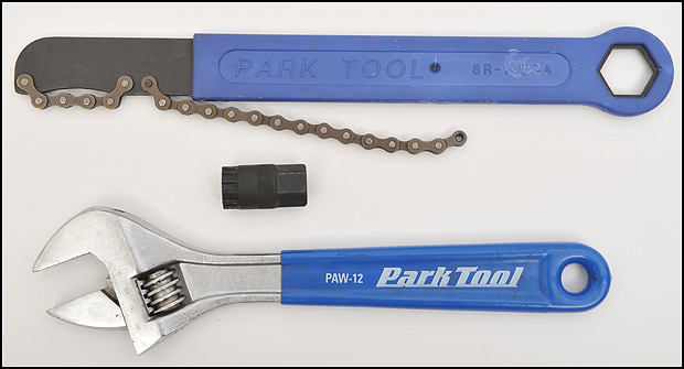 In the middle is the cassette lock-ring tool which simply fits into the splines on the lock-ring. My advice here would be to not bother scrimping (the same goes for all tools really) as I’ve lost count of the number of broken cheap ones that I’ve seen. Buy something decent like a Park one and it’ll last you forever.