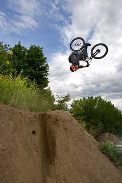 That’s something that I wouldn’t want to try on something like brick or Tarmac. That’s one of the benefits, when you dig it out yourself you make it exactly how you want it. And that’s some of the most fun I’ve had on my bike recently was building obstacles and riding them. I get a lot of satisfaction out of it. The flip fakie was pretty tough because of the crashes. I’ve never done a trick that you crash two or three times in one impact. You run into the wall and flip over and land on your back and the bike lands on top of you. There’s no other trick I’ve tried where you fall out of the sky. But it’s cool putting yourself in that position.