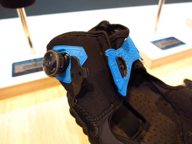 Tav: This is the knee/shin combo, unlike the knee pad we have an open back system, if we find there is a demand for an open back knee guard then that is something we will look at in the future. The knee/shin combo is obviously a longer pad and the open back design allows the rider to put the pad on more easily. We have used the same Boa system to secure the pad and these additional clips hold the lower section in place, these are the same clips they use in the medical industry for braces and so on. We have some additional Velcro straps at the base – it does have its place but we have kept it to a minimum.