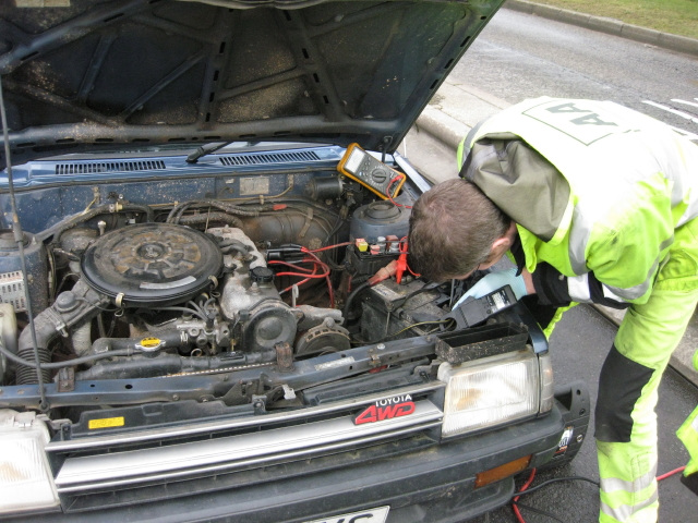 At low revs the battery light comes on ! while driving it goes out, however the battery is not charging and i have been running on the stored charge, when this got down to 8.2 volts the car shut down, The men from the AA where impressed it ran that low as most modern cars with computers will shut down when it drops to 9.6 volts, a few tests, lots of multimeter action, then a whack on the alternator with a hammer and the charge light goes out (thats good) i am happy to carry on the battery is getting a healthy dose of volts, Matthew tells me to drive to the next service station Tibshelf, he will follow, as i leave the services the charge light comes on again and off at higher revs, as i enter Tibshelf the light comes back on. Heres the issue, i am a 4wd they have no info on my car (old ) and after Tibshelf i enter the M1 roadworks, no hard shoulder for a very long distance, i may get through the roadworks, but with no charging i will break down again, and being 4wd if i breakdown in the roadworks they cant tow me out i will need lifting to a lorry ( most recovery vans now lift the front wheels as this is safer than a tow bar and dosent require you to steer the car and break and stuff) some 4wd drive systems cant be unlocked for towing, you cant lift the front wheels if they are going to rotate as the rear wheels rotate.