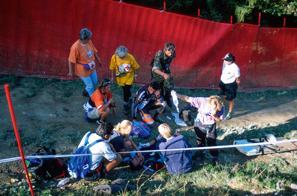 By 1997 Gachet was on the Sunn Nike team that included a veritable who’s who of names in both DH and XC disciplines. On the fateful day of Gachet’s crash I was slowly making my way down the piste after a session shooting practice. I had gone over a rise when I heard loud screaming from above and went to investigate. There was already a group of people surrounding the stricken rider. Italian former DH World Champ Giovanna Bonazzi was shielding the sun from Gachet’s face and medics had inserted a drip. I grabbed two frames of the entire scene and then walked down the track below the group and took more frames of his injury. His leg was clearly broken. These shots have been shown before and are not worth seeing again. This happened very soon after the death of Princess Diana and the whole ‘should we/shouldn’t we’ shoot was at the front of my mind. There was no way I wanted to intrude, but there was little I could have done to help. Gachet was in experienced and professional hands, so I made the decision to do my job, which was to document. Suffice to say that the French powerhouse was never the same. Whether it was a confidence or age (he was 32 at the time) or a combination of the two, Francois Gachet melted away to leave the way open for a newer breed.
