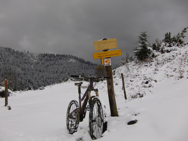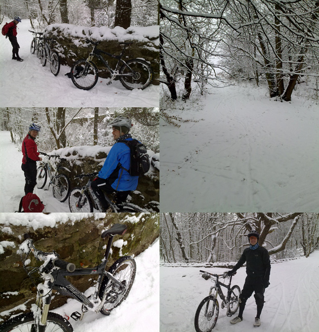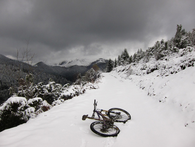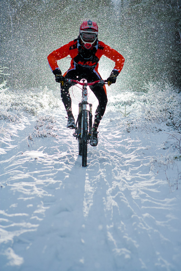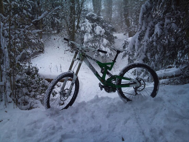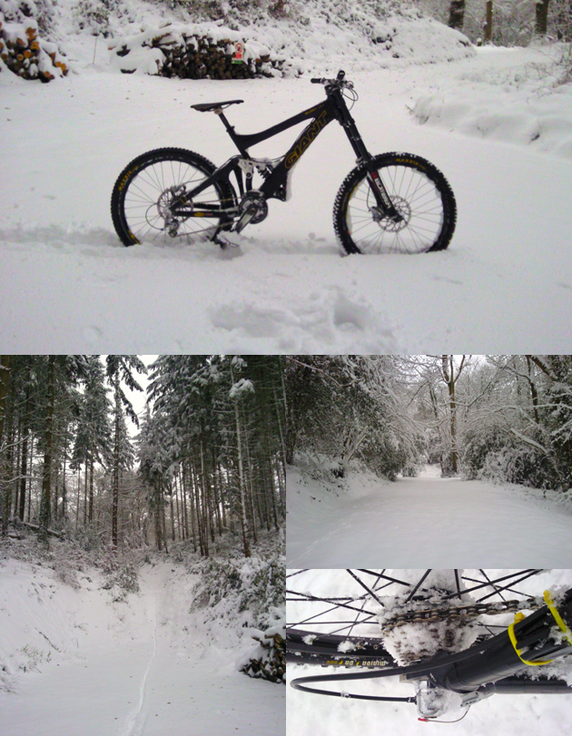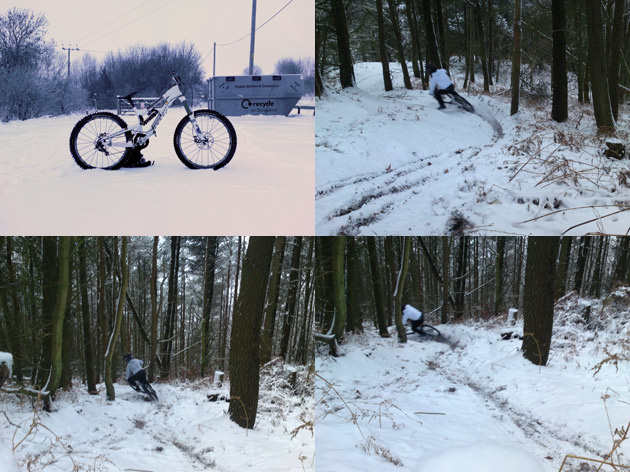 Gareth: “Some photos of riding in Stoke woods Exeter….yep Exeter! I was the first person to ride the track and saw no one else the whole day, awesome. It was about 1.5ft – 2ft deep. Loads of grip in the fresh snow, but hard work to get any speed! The picture of my bike….its only held up by the snow….honestly!”