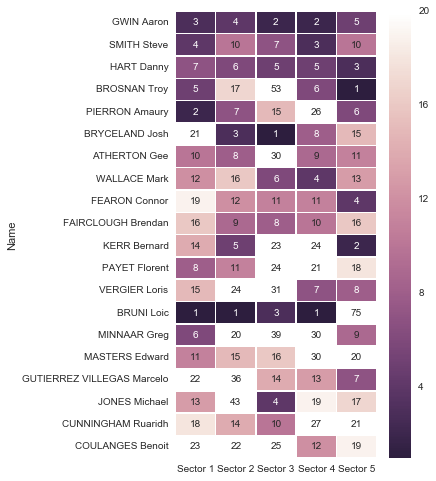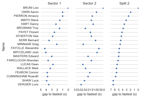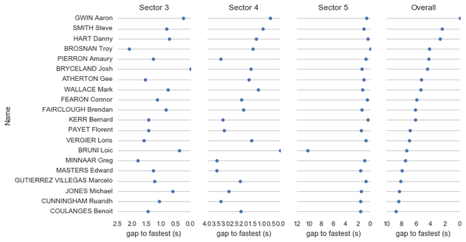 As you can see, the first two sectors were the longest, making up more than half of the total time. A good sector 1 and 2 set you up for a good overall position. You couldn’t make up a lot of time in sector 3, at less than 20 seconds long but you could certainly lose some. The final minute of racing was split across the last two sectors at just under 30 seconds each. Let’s take a look at how the top 20 fared across the sectors…