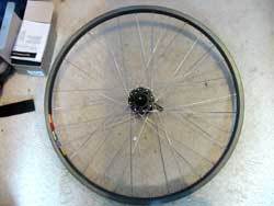 10. Repeat the last two steps for the other side of the wheel. It’s easy to identify the relevant rim holes now, as there aren’t many left. With everything in place your wheel should look a bit like this, with the valve hole between two roughly-parallel spokes and all the spokes on one side of the hub going into rim holes offset to the same side. If it looks all asymmetrical or some of the spokes wouldn’t reach you’ve done something wrong…