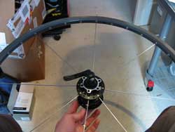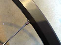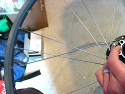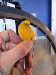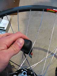13. Finally, start at the valve hole and work around the wheel tightening the spokes a turn at a time. Don’t look at the spokes end on – there’s a chance they’ll break as you tighten them and shoot out of the rim. Put a rim strip on if you’ve got one handy. You’ll need it when you’re finished anyway. Keep tightening the spokes until they’re as tight as your comparison wheel.