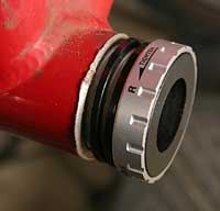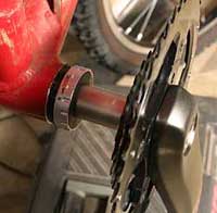 3. Conventional bottom brackets come in a bunch of different sizes to accommodate different shell widths, cranks and the use or otherwise of E-type plate-mount front derailleurs. HTII is a whole lot simpler – one size fits all. You get three 2.5mm spacers in the box, which sit behind the bearing cups in different combinations according to shell width and front mech mount. Here we’re using a 68mm shell and a band-on front mech, which needs two spacers on the drive side and one on the non-drive side. If we were using an E-type mech we’d leave out one drive-side spacer and replace it with the mech plate. For 73mm shells you’ll need to leave out the non-drive side spacer and run either one spacer or the mech plate on the drive side.