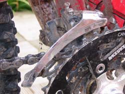 9. So far so good. Drop back down to the middle ring. If it won’t go, you’ve got too much cable tension and need to turn the barrel adjuster inwards a little. If you run out of adjustment on the barrel adjuster you’ll have to reset the cable tension at the mech clamp bolt. If you land in the middle ring OK, check for the chain rubbing on the cage with it in the small and big sprockets out back. You’ll probably find that it rubs in one position. In theory you should be able to make it not rub in either, but in practice it’s nigh-on impossible, particularly if you have a wide-range rear cassette and short chainstays. We like to prevent rubbing in middle/big ‘cos we use that gear a lot, but aren’t too bothered by middle/little rub. Use the barrel adjuster to tweak the position of the cage until you’re happy.