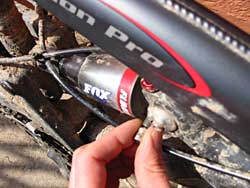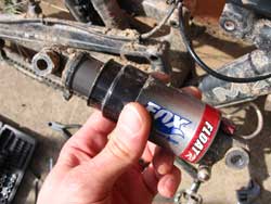 2. Before you start messing around with an air shock, take all the air out first. Sounds obvious, but don’t forget unless you fancy dodging some high-speed shock parts. Use the valve cap back to front to release the air valve. Fox shocks have a negative spring too (it’s inflated from the positive spring automatically), so when you think you’ve got all the air out, lift and compress the back end of the bike a few times and release the air again – there’ll probably be a little bit more.