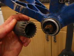 In best Haynes manual tradition, Refitting Is The Reverse Procedure As Removal. Coat the new BB drive-side threads with anti-sieze and thread it into the shell. Remember it threads in anti-clockwise. The key thing is to keep the unit aligned so it threads in straight – getting it cross-threaded is bad news, particularly on an aluminium frame… If you’re having trouble getting the thread started, turn it slowly the wrong way while applying gentle inwards pressure. At some point it’ll clonk in to the start of the thread and you can start turning it the right way. You should be able to drive it most of the way in just by hand – if it takes more effort, something’s wrong. Use something with a bit of leverage to snug it home. It’s obvious when it’s in, it suddenly stops turning.