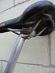 2. There are two basic types of seatpost that you’re likely to encounter. This is the most basic, the layback single-bolt microadjust type. “Layback” means that the centre of the clamp that holds the saddle rails is offset rearwards relative to the centreline of the post itself. Typically, this type of post just has a single bolt. The rails are clamped between two pieces that sit in a serrated cradle atop the post.