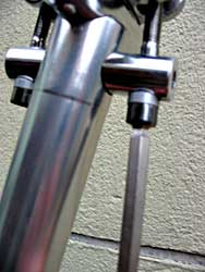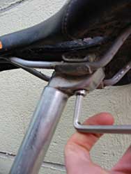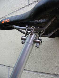 7. In-line posts typically have more parts, but with any luck undoing both bolts as far as you can without actually taking them apart will give you enough clearance to push the lower part of the clamp out sideways. Then you can position the saddle either by sliding it over the upper part of the clamp from the front (so the clamp passes between the rails at the back of the saddle where they’re further apart), or by putting the saddle over the clamp sideways and twisting it into position or by some other cunning method of your own devising. Then slide the lower part of the clamp back in and snug both bolts down.