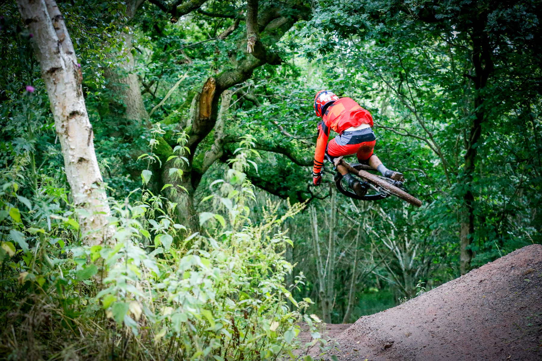 A bridge crosses the uplift road and the tempo rises. The track widens too and it becomes all about the jumps for the next half of this particular track. And they’re sizeable examples to it has to be said. There’s an alternative route to many of the senders but then as it settles a fork in the track sets the rider up for darker stuff ahead. Go left and its all relatively mellow “Boneyard” stuff but hang a right, the mountain ash slightly obscuring the name of this section, and the pace rises even further. And it was here in “Ninja Alley” that Shaun started skimming the berries of the mountain ash even on this sloppy day.