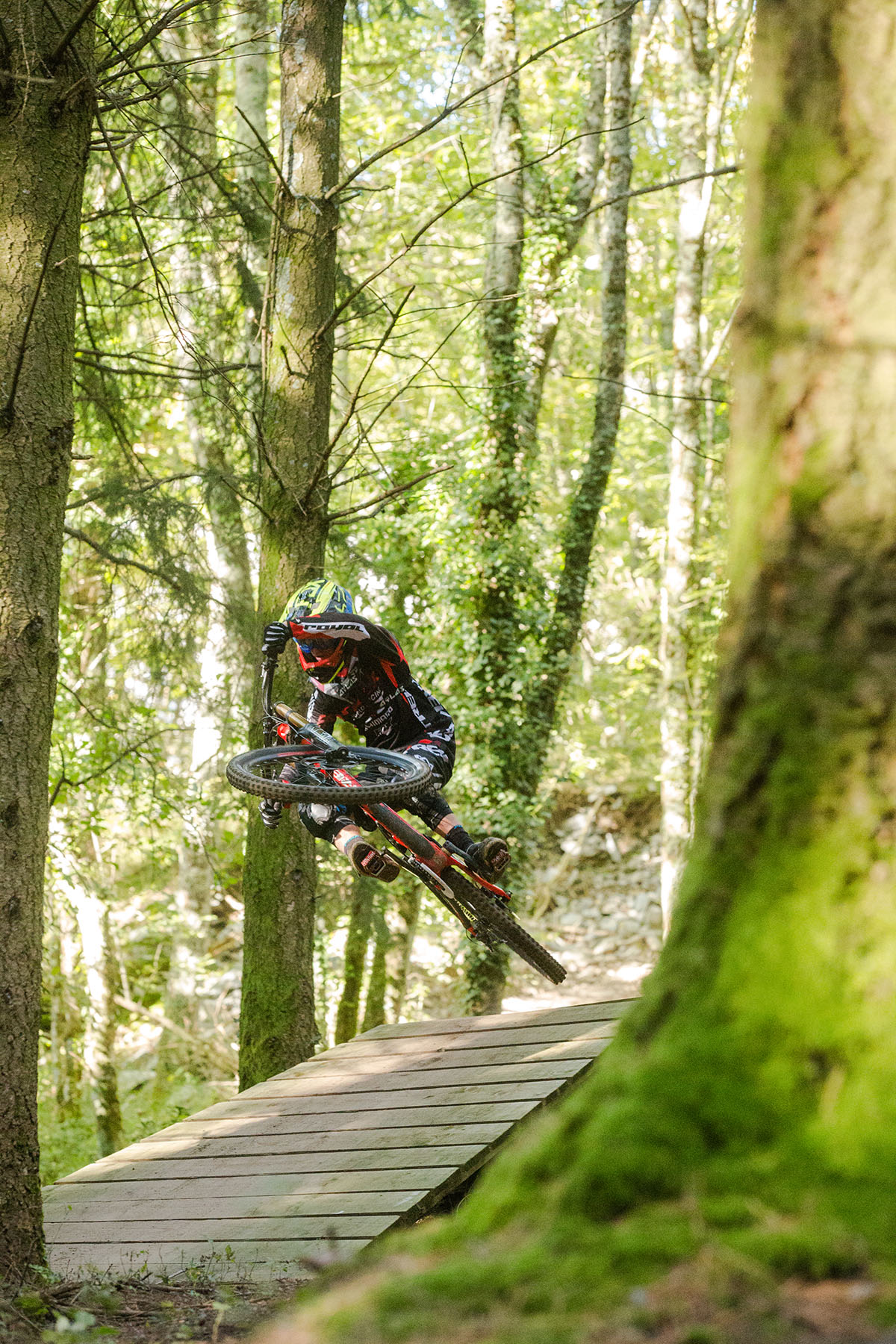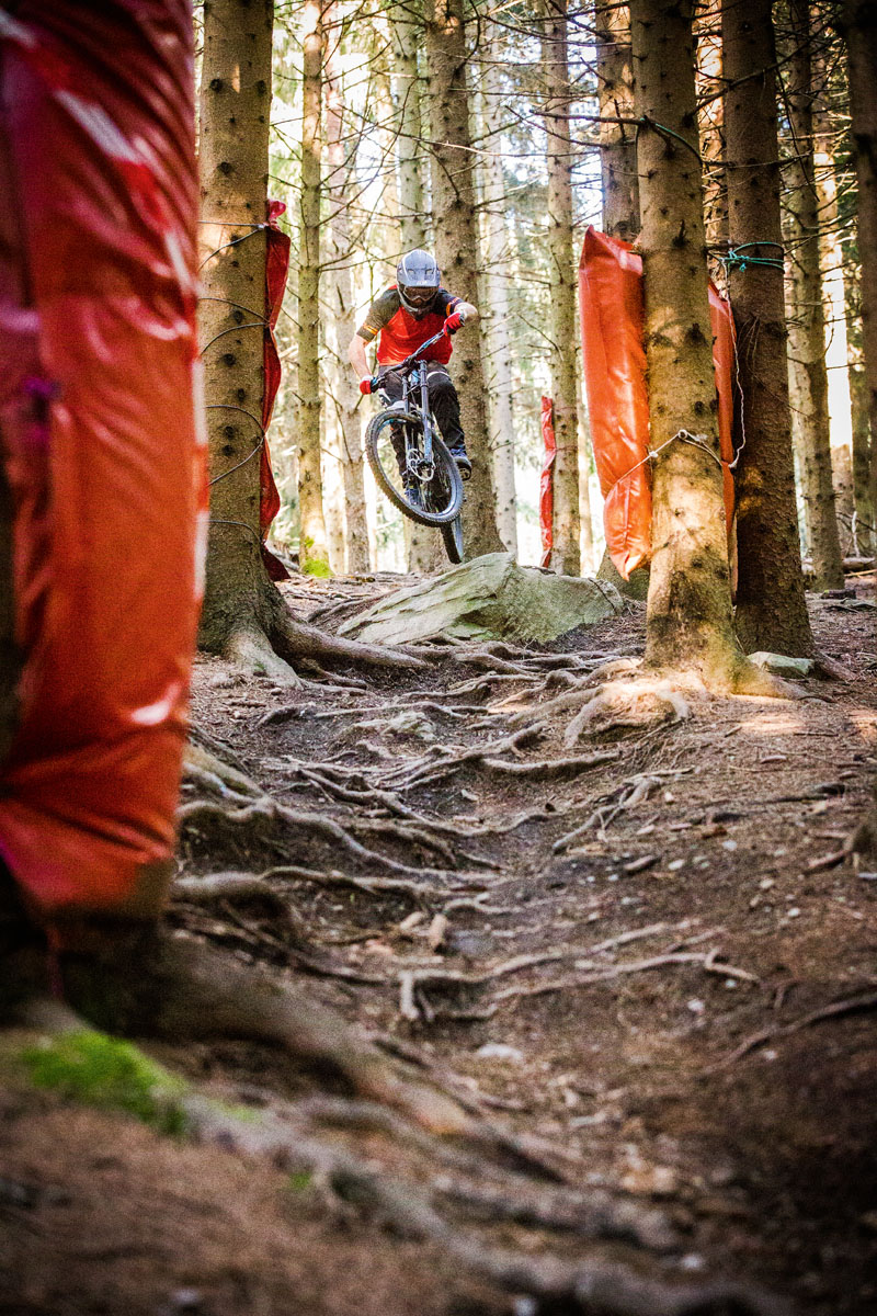 That rest is needed to compose oneself before heading into the true bonkers stuff down low. Ironically the hill mellows in gradient but the track gets steeper as it points straight down into a ruck of high-speed holes, punishing sharp rocks, undulating crests and drops and edge-of-the-tyre turns. This lower final minute or so of track is what I personally found to be the true balls-to-the-wall stuff. Arms tiring, concentration faltering and you have to deal with a reasonably narrow track considering the potential speeds that are available through the trees here. Eventually you are spat out of the forest and into a final fast dash to the finish line… if the final jump doesn’t get the better of you.