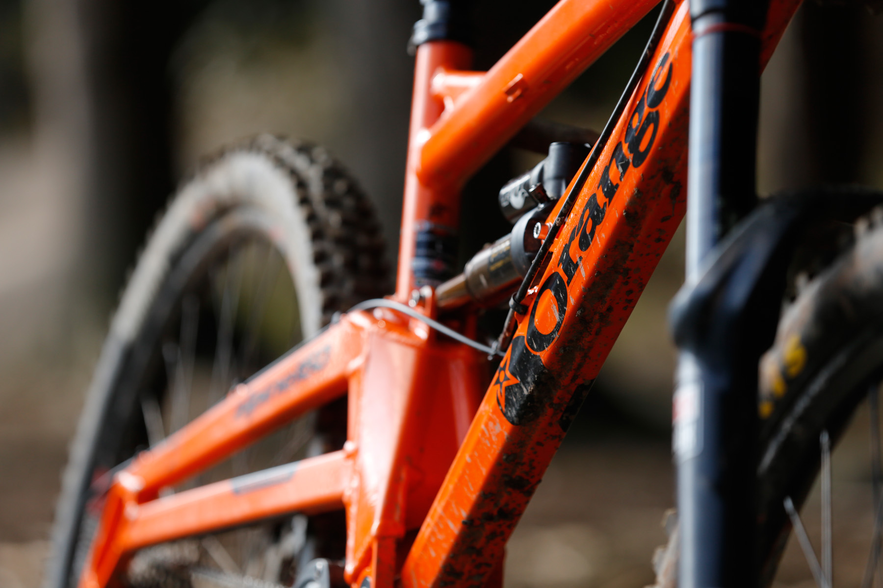 SHAPE AND PURPOSE. The bike that cut its teeth on the vertiginous slopes of Verbier intent on getting from A to B in higher places has not quite been re-purposed as the do-it-all bike of everything UK just yet. Still, like its stable mate the Orange Five – a backbone of trail riding – it’s a bike that is built on simple ideas carried out smoothly. No fancy carbon lines, no daft suspension rate curves, just a well-angled aluminium bike with a hefty lick of West Yorkshire paint. But too much paint maybe?