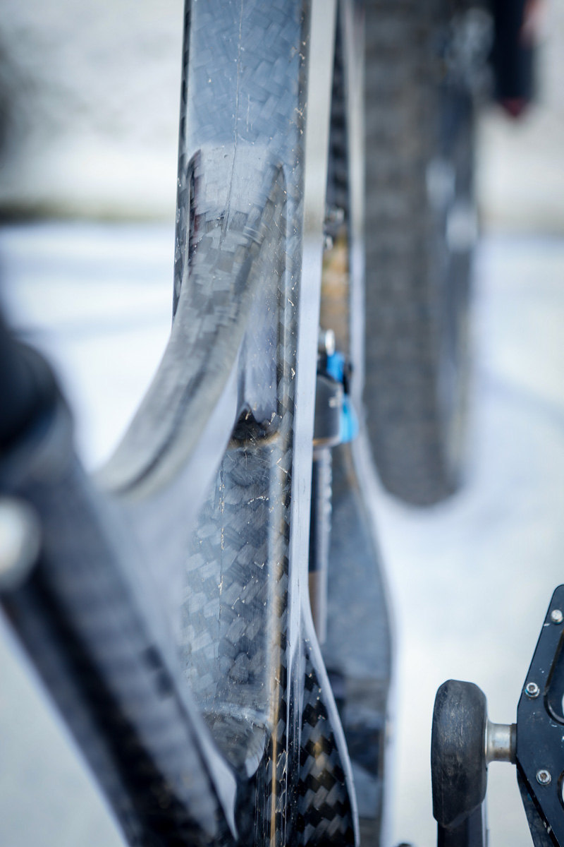 Maybe all you might see is carbon, after all there is a lot of it, but remember this is a first prototype without any lick of paint. And that as much as this material dominates the high-end bikes in particular there is huge inconsistency in the feeling that each bike achieves, many offer too much stiffness and some too little.