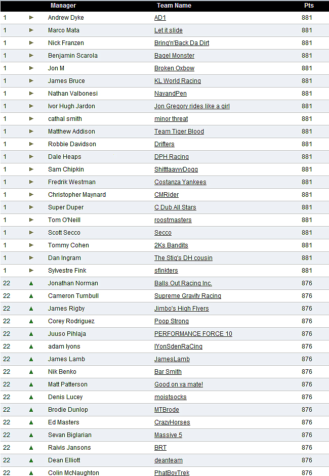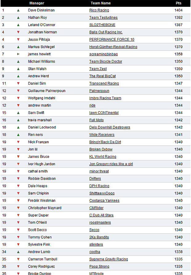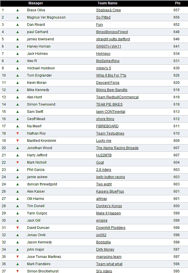 After a 21 way tie for first place after the first round things have now started to spread out with Dave Dinkelman and his ‘Rico Racing’ Team now sitting in the top spot all on their own. Obviously everything is still to play for, so if you want to check out where you’re currently sitting, or make some more team changes ready for Fort William this weekend (these need to be made by 14:30 BST on Saturday), then get on over to www.dirtfantasyleague.com