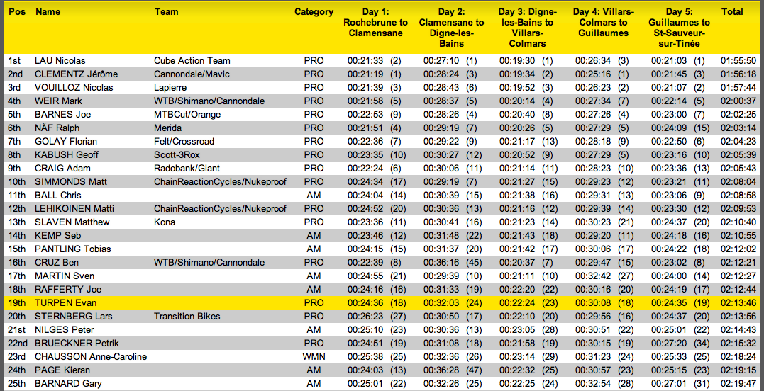 More of the spirit of camaraderie was seen at the top of the second Col, and the start of Special Stage 3. Mixed groups of riders clean the last of the climb, maybe led out by a pro downhiller with a xc world cup racer in tow, the most unlikely grouping of riders imaginable taking turns to slug it out in front. Taking time to catch their breath, sitting along the edge of the start of third Special Stage to cheer each other on through the first few switch backs . Imagine dropping in to a section and being whooped and whistled for your efforts by Mark Weir, Fabien Barel, Nico Vouilloz , Nicolas lau , Matti Lehikoinen ,Anne-Caroline Chausson and Adam Craig to name but a few and you’re just a regular rider who’s out for the week to take part. Where else are you going to being cheered on by some of the fastest riders in the world? All of this happens, and it only happens at Mavic® Trans- Provence!