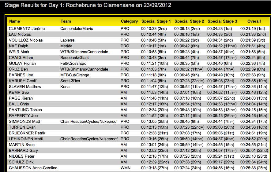 A short liaison stage led riders to a brand new Special Stage two for 2012, which started with steep switchbacks and ends in singletrack that crisscrosses a stream – There were a number of crashes including Geoff Kabush using his face as a rudimentary brake! …and while no serious injuries occurred the alarming view of Anka Martin riding into the feed station bleeding from around her eye after getting caught with a branch is reminder of how a small thing can potentially end your race and that this is a race that has a long way to unwind before it reach It’s final destination at Monaco .