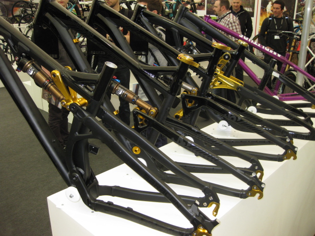Team Issue, and above the shocking pink linkage production Myst Team £4899.99 a cheaper spec but sharing the same frame Myst Pro with boxxer RC forks in black&yellow is £2999.99 both share the carbon fibre rear triangle, a frame only with kashima DHX RC4 will set you back £1749.99 haven’t ridden one and they were bolted down so couldn’t perform a car park squish test on one.