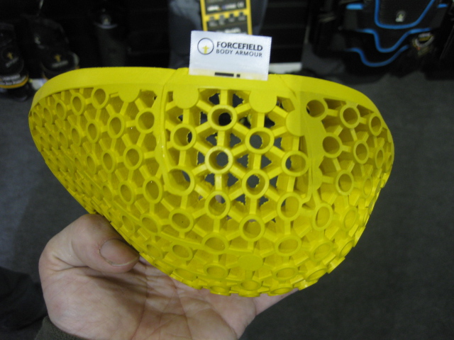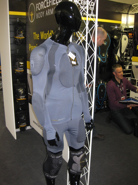 In very simple terms (it’s a more technical material than I make out) it’s a honeycomb of Nitrex Evo and other laminates to make up the padding that absorbs and dissipate impacts. Feels like soft rubber, very light, very airy, so not as hot and sweaty as more traditional armour, the jackets are made from Be-Cool fabric and wick away mositure. The seperate back protectors come in CE level 1 £94 or level 2 £119 rating. The grey colour Pro jacket on the display dummy, shirt has an intergrated back plate thats CE level 2 rated, pads can be removed the grey jacket is £189, there is an Action shirt with no back plate for £149 the shorts are £89, Knee pads £74, Elbow pads £69.