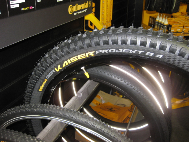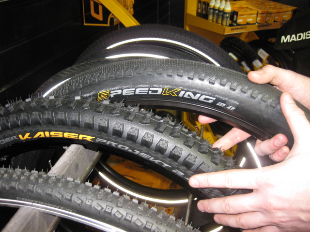 Tucked behind that was the SpeedKing, an xc race tyre, a very light race tyre, that Rob from Conti was a bit excitied over as he has been running them on a dirt jumper. Pumped right up they are scary fast but don’t expect to see dirt jumpers in lycra just yet down the jumps. I liked the 700c mountain king in the foreground, that’ll fit my 29er that will, on that front the 29er Rubber Queen has been beefed up a bit as well.