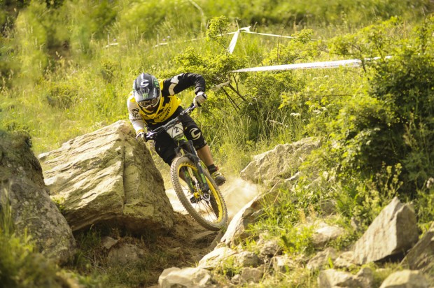 Jerome Clementz narrowly avoiding a boulder at Les 2 Alpes – Photo: Ben Winder