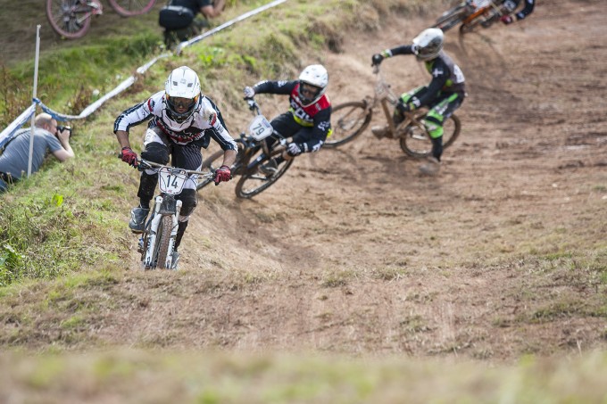 In the elite men’s it was all to play for. Scott Beaumont and Lewis Lacey were not present as they were both preparing for the next round of the 4X ProTour in Czech Republic next week. So it was wide open for a fresh winner on the 2014 series. Davi Roberts took the win in the B final to secure 5th overall for the day and his first elite podium. In the final it was Will Evans, Duncan Ferris, Dave Richardson and Leon Rosser. The gate dropped and it was tight but Evans had the lead. Richardson was on him all the way to the last turn where a slip let Ferris into 2nd. In the mess, Rosser also crashed out. Across the line it was Evans followed by Ferris, Richardson and Rosser.