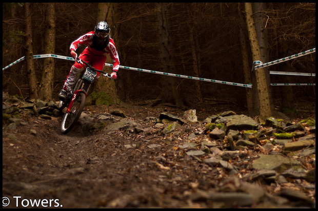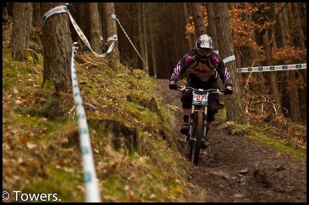 Rumours were flying around that the track would be steeper than the fitness based round one track, with bikes skills and the carrying of speed high on the agenda for this weekend. The rumours turned out to be true and the track was brilliant, a true Innerleithen bar bashing beast, with true knuckle-smashing capabilties it was tight in places, but overall quite fast and scary. The faster you rode it the closer those trees got and i saw more than a couple of squished pinkies over the course of the weekend. The course went straight out of the start hut and into the Gold run firing you out across the fire road at a hell of a speed before dropping straight back in for some more ‘Scottish Tree Slalom’. Whilst being taped quite narrow for the majority of the track there were portions of width, offering line choice for those with the skill and nerve to take on the faster options at point-five-past-light-speed. The stepdown just before the road crossing was causing problems all weekend for many of the riders, with many ending up in the crashpads on the fence or sliding across the freshly gravel coated tarmac. A quick sprint to the finish was all that remained to round up over 3 minutes of solid descending for most. The new Saracen Bikes were there in tha Alpine Bikes tent for demo all weekend and i was quite surprised to see that the Myst was hardly in the stand for most of the Saturday Practice, with it doing many a trip down the trail. Expect to see a few of these at the races this season