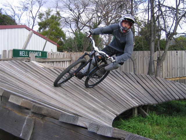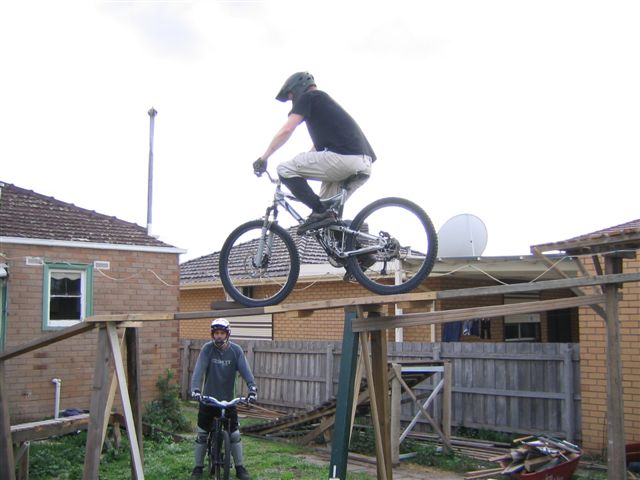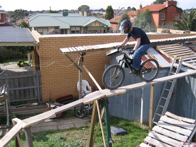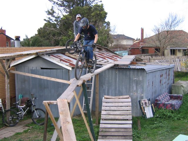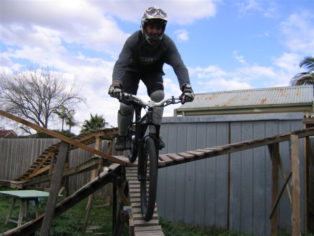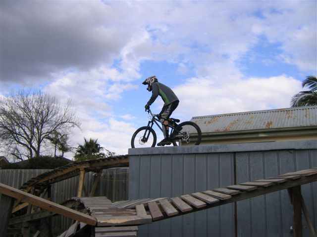 “Basically it started with a couple of ideas and the man of the house Timbot is a builder who had access to wood that was being discarded so he started to bring it home from demos he was doing. One thing led to another and before we knew it we had built the berm at the back which led up to the top of the shed and we were hucking off the roof onto that big ramp. Next thing we decide to add more so we can keep riding round and round and in the end we went a bit silly and more or less covered that back yard. We had the berm, two drops, see-saw, skinnies both high and low plus the roll in to step up running down the fence line and some other bits and pieces. Some of the lines were pretty hard to clean, especially the full skinny after the teeter. The whole thing claimed a few victims, full dislocated shoulder, someone fell and landed on their head and nearly broke their back plus a heap of grazes.