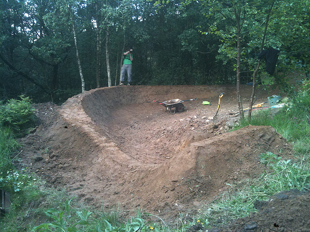The pics were taken a while ago now…the berm has been ridden and it all works pretty sweet. Just gotta sort the drainage out properly and tweak a few things. The step-up jump out of the berm links in with the upper berm flyoff jump – merging the lines, which then all lead into a big trick jump/step up to finish the lines.